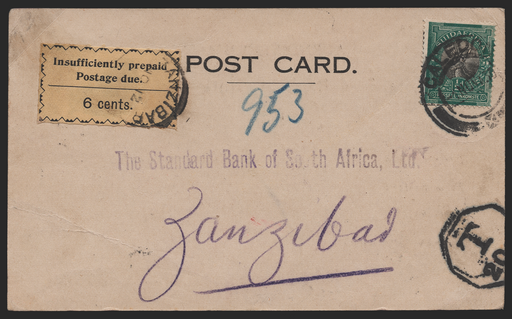 £495.00| /Zanzibar 1930 (Nov) incoming postcard from South Africa, being an acknowledgement from the Standard Bank of South Africa at Caledon (near Cape Town...