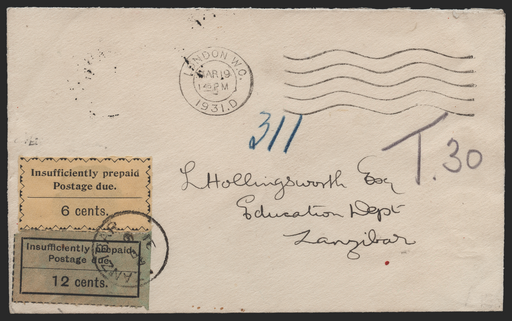£950.00| /£950.00 Zanzibar 1931 (AP 9) incoming unpaid "Hollingsworth" cover from London, with machine despatch date stamp of "MAR 19 1931" and pencil "T.3...