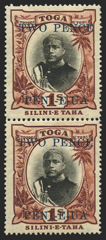 £250.00| /Tonga 1923-34 2d on 1s black and red-brown, type 27 surcharge, watermark upright, vertical pair showing variety "No hyphen before TAHA" on upper st...