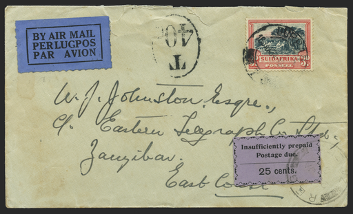 £850.00| /Zanzibar 1934 (18 JAN) incoming airmail cover from Durban, South Africa with black/blue trilingual airmail label, underfranked by 1930-45 3d black ...