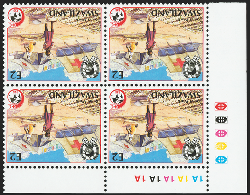 £140.00| /Swaziland 1989 Red Cross 2e, variety watermark Crown to right of CA (as seen from back), upper left corner block of 4 with '1A' (x5) plate numbers,...