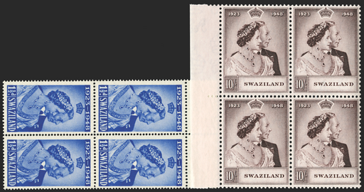 £140.00| /Swaziland 1948 Royal Silver Wedding 1½d ultramarine and 10s purple-brown, SG46/7. Pristine marginal blocks of 4 of this fine stamp issue, unmounted...