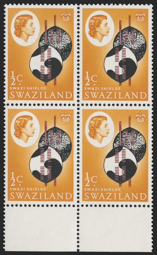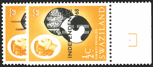 £425.00| /Swaziland 1968 Independence ½c black, brown and yellow-brown, type 42 overprint, error BROWN OMITTED, lower marginal with sheet marking proving pos...