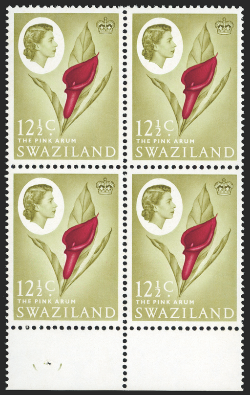£250.00| /Swaziland 1962-66 12½c carmine and grey-olive "The Pink Arum", variety WATERMARK INVERTED, lower marginal block of 4 from a left pane with sheet ma...