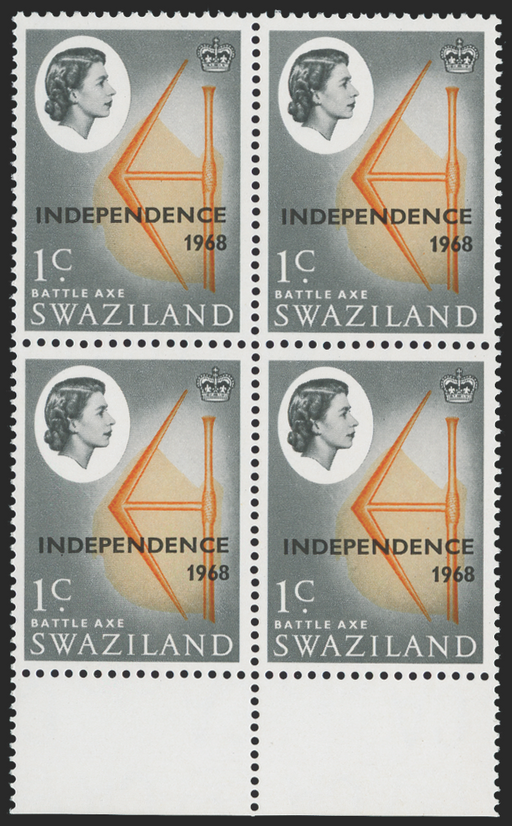 £160.00| /Swaziland 1968 Independence 1c yellow-orange and black, type 42 overprint, variety WATERMARK INVERTED, lower marginal block of 4, SG143w. A very fi...