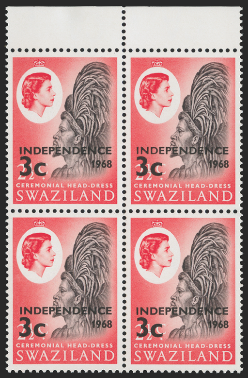 £125.00| /Swaziland 1968 Independence 3c on 2½c black and vermilion, type 42 overprint, variety WATERMARK INVERTED, upper marginal block of 4, SG146w. A very...