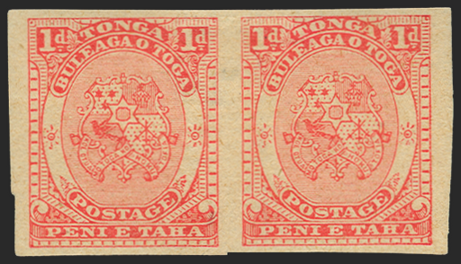 £140.00| /Tonga 1892 1d pale rose "Arms of Tonga", imperforate plate proof horizontal pair, SG10. A fine quality printer's plate proof with good to large mar...