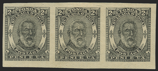 £175.00| /Tonga 1892 2d plate proof in black on vertically laid paper, imperforate horizontal strip of 3, SG11. A fine quality strip of this rare printer's p...