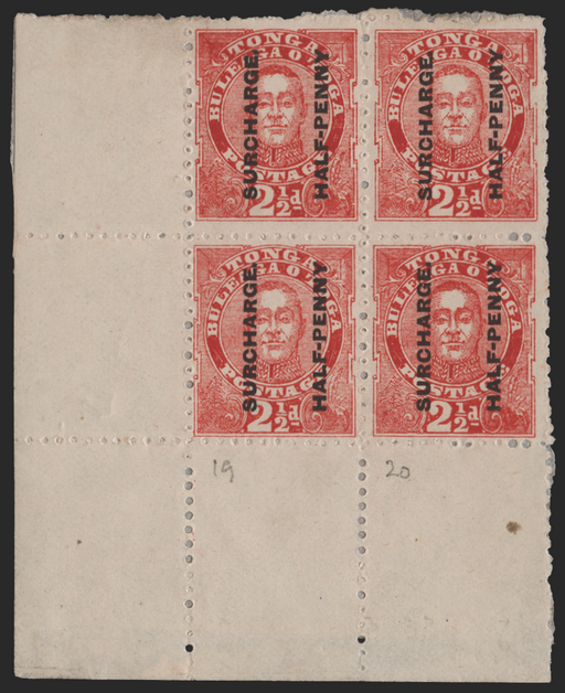 £125.00| /Tonga 1895 (20 June) ½d on 2½d vermilion (type 12a), lower left corner block of 4 from left pane (positions 13-14/19-20), SG29. A fine mint positio...