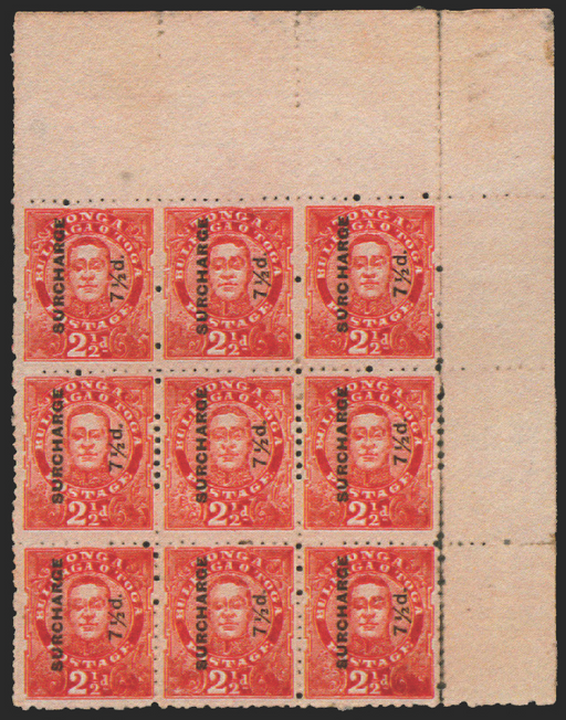 £350.00| /Tonga 1895 (20 June) 7½d on 2½d vermilion (type 12a), upper right corner block of 9 from right pane (positions 4-6/16-18), showing varieties "Missi...
