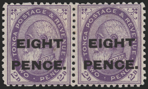 £200.00| /Tonga 1891 (10 Nov) 8d on 2d violet, type 4 surcharge, horizontal pair, the right stamp showing variety "Short T in EIGHT", SG6a. A fine and fresh ...