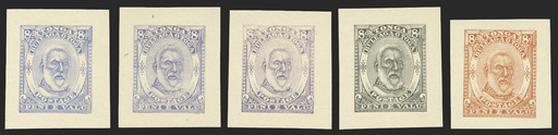 £495.00| /Tonga 1892 "King George I" 8d, five die proofs in grey-blue, violet-blue, grey-lilac, black and chestnut, on yellowish wove (c. 25x27-30mm). SG13. ...