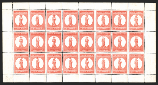 £800.00| /Virgin Islands 1887-89 4d chestnut, watermark CA, complete sheet of 24 (8x3), SG35. A brilliant quality mint complete sheet with original gum and w...