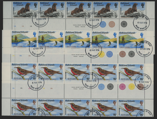 £375.00| /Falkland Islands 1974 Tourism 2p, 4p, 15p, 'set' of three (5p not issued in this form), each in a GUTTER BLOCK OF TEN showing plate numbers '1A', i...