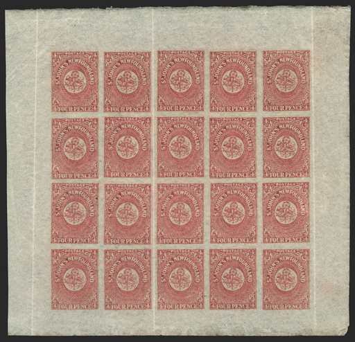 £950.00| /Newfoundland 1862-64 4d rose-lake, complete sheet of 20 (5x4), with "(ST)ACEY WISE/1858" large part papermaker's watermark covering six stamps in t...