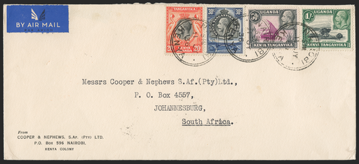£550.00| /Kenya, Uganda and Tanganyika 1936 (11 JY) long airmail cover to South Africa, attractively franked at 2s rate (50c per ½oz airmail postage x4) by 1...