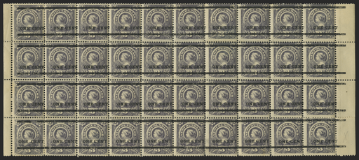 £2,950.00| /Newfoundland 1897 (19 Oct) "ONE CENT" on 3c grey-purple, block of 40 (10x4, with sheet margins at left and right) from positions 11-50 of the setti...