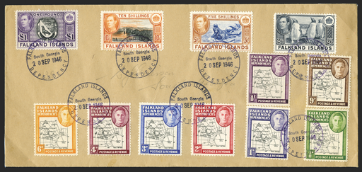 £550.00| /Falkland Islands Dependencies 1946 (20 SEP) locally addressed cover, bearing 1946 "Thick Map" set of 8 and Falkland Islands 1938-50 2s6d to £1 (193...