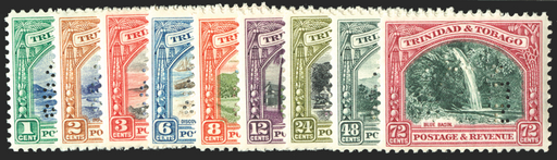 £180.00| /Trinidad & Tobago 1935(-37) Pictorial set of 9 to 72c, perforated 'SPECIMEN' (type B9), SG230s/8s. A brilliant quality mint set with original g...