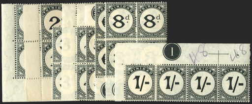 £550.00| /Trinidad & Tobago 1905-06 set of 8 to 1s, 1d to 8d Postage Dues in blocks of 4, watermark MCA (1d, 2d, 4d, 5d, 6d corner marginal with plate nu...