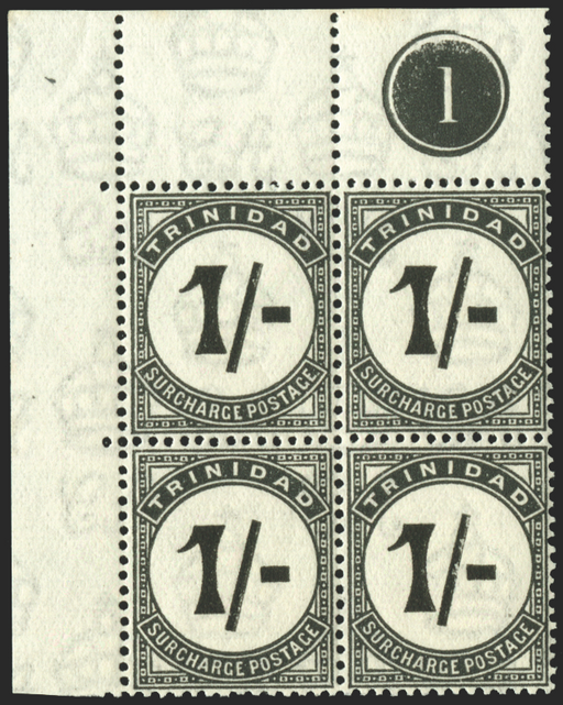 £450.00| /Trinidad & Tobago 1923-45 1s black Postage Dues, script watermark, upper left corner plate number '1' block of 4, SGD25. A fine unmounted mint ...