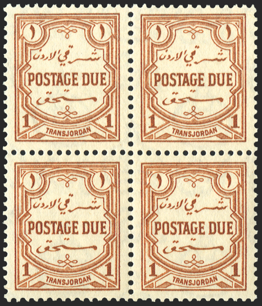 £650.00| /Transjordan 1929-39 1m red-brown Postage Due, type D26, perforations 13½x13, SGD189a. A very fine unmounted mint block with full original gum. Espe...