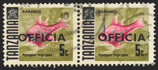 £120.00| /Tanzania 1970-73 5c on glazed paper Official, type O4 local overprint, horizontal pair, left stamp (R10/9) showing 'OFFICIA' error and right stamp ...