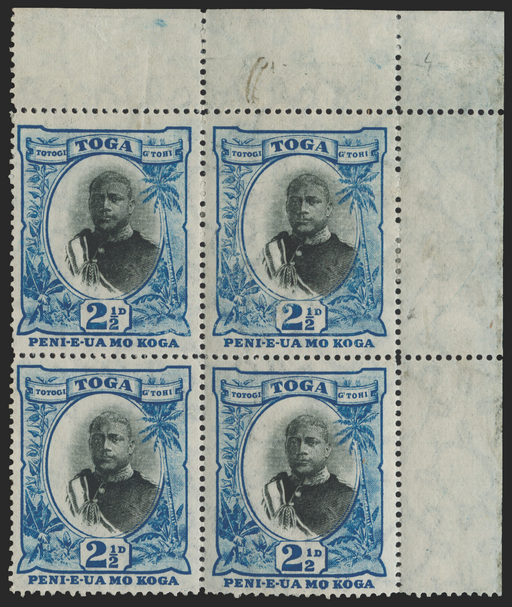 £150.00| /Tonga 1897 2½d black and blue, watermark sideways, upper right corner block of 4, R2/10 showing variety 'No fraction bar in '½', SG43b/ba. A fine a...