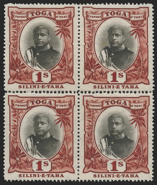 £195.00| /Tonga 1897 1s black and red-brown, block of 4, the upper right stamp showing variety 'No hyphen before TAHA' (R3/5), SG50a. A brilliant quality min...