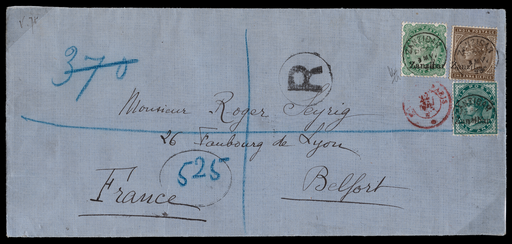 £950.00| /Zanzibar 1896 (3 MY) registered cover to France, franked at 4a6p (2a6p postage + 2a registration) by 1895-96 Overprint on India ½a blue-green, 1a6p...