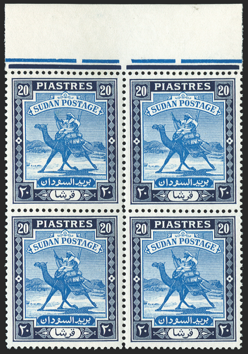 £150.00| /Sudan 1948 New Arabic 20p pale blue and deep blue, chalk surfaced paper, perforations 13, upper marginal block of 4, SG110a. A superb unmounted min...