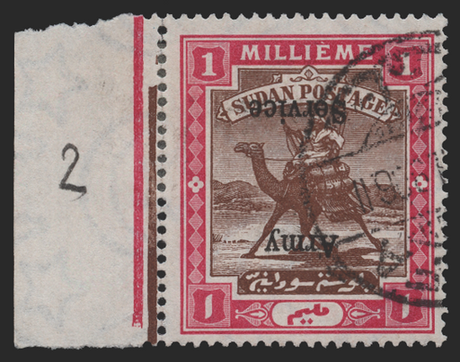 £800.00| /£800.00 Sudan 1906-11 1m brown and carmine Army Service, type A3 overprint (12mm space), error OVERPRINT INVERTED, left marginal, SGA6b. A very f...