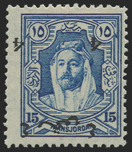 £190.00| /Transjordan 1929 (1 Jan) 4m on 15m ultramarine Postage Due, type D25 surcharge, ERROR SURCHARGE INVERTED, SGD185a. A very fine unmounted mint examp...