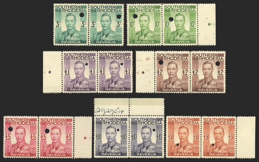 £425.00| /Southern Rhodesia 1937 King George VI large format Revenue 3s, 10s to £10, £50, seven values, printer's file examples with punched security holes, ...