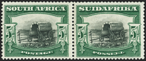 £250.00| /South Africa 1927-30 Pictorial 5s black and green, perforations 14, horizontal pair, SG38. A fine and fresh mint pair with original gum. A few shor...