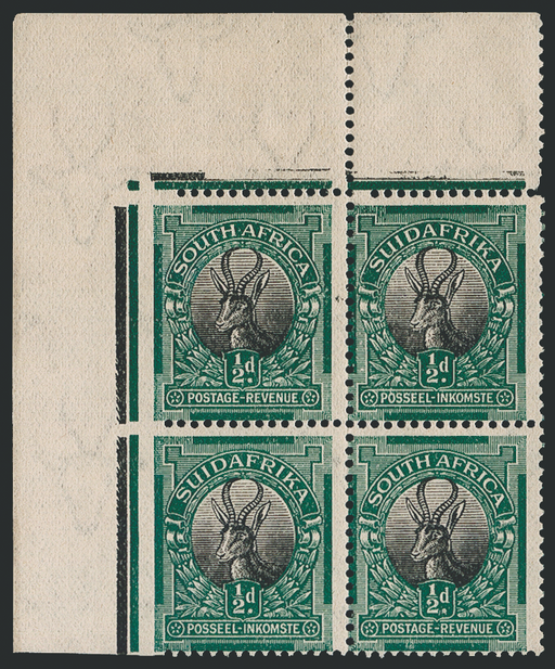 £850.00| /South Africa 1926-27 ½d black and green, 'Pretoria' typo printing, upper left corner block of 4, error IMPERFORATE BETWEEN STAMPS AND LEFT MARGIN, ...