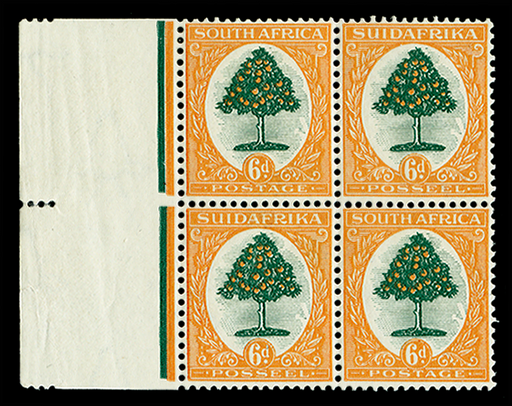 £195.00| /South Africa 1926-27 6d green and orange, London printing, variety watermark inverted, left marginal block of 4 (with unperforated left margin) SG3...