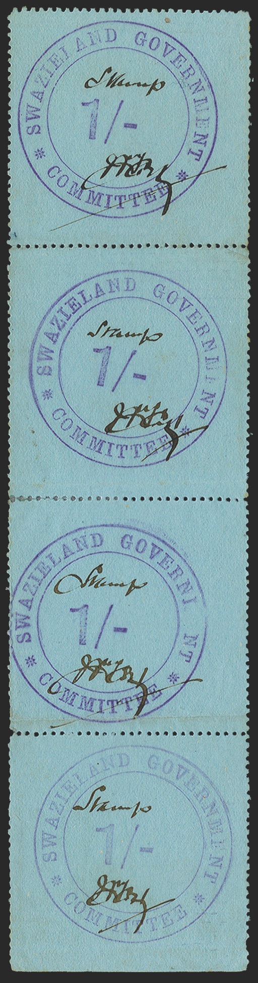 £750.00| /£750.00 Swaziland 1890 1s 'SWAZILAND GOVERNMENT/COMMITTEE' violet handstamp on blue paper, vertical strip of 4, each stamp cancelled with M/S 'St...