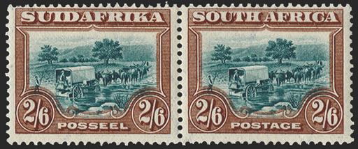 £95.00| /South Africa 1927-30 2s6d green and brown Recess pictorial, perforations 14, SG37. A fine mint pair with large part original gum. A few short perfo...