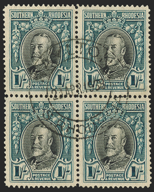 £600.00| /Southern Rhodesia 1931-37 1s black and greenish blue, perforations 14, SG23b. A very attractive used block of 4, neatly cancelled by a lovely centr...