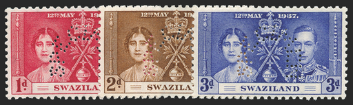 £100.00| /Swaziland 1937 Coronation of King George VI set of 3, perforated 'SPECIMEN' (type B9), SG25s/7s. A fine mint set with large part original gum to or...