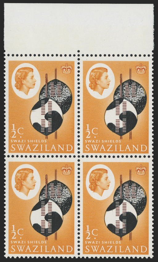 £150.00| /Swaziland 1962-66 ½c black, brown and yellow-brown, "Swazi Shields", variety WATERMARK INVERTED, upper marginal block of 4, SG90w. A very fine posi...