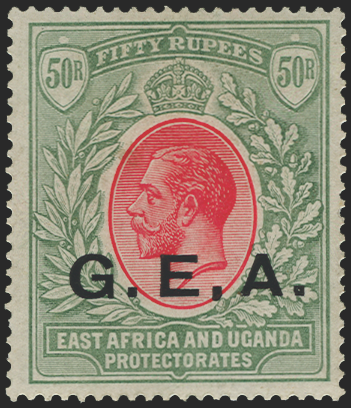 £850.00| /Tanganyika 1917-21 50r carmine and green, type 2 'G.E.A.' overprint, variety 'very large stop after E' from R5/3 in the setting of 60, SG62var. A f...