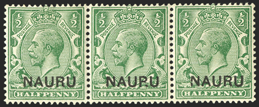 £450.00| /Nauru 1916-23 ½d yellow-green, type 1 overprint, horizontal strip of 3, the centre stamp showing variety 'NAUP.U' from 'I16' printing, R6/2, SG1a. ...