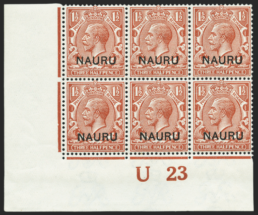 £395.00| /Nauru 1916-23 1½d red-brown, type 1 overprint, lower left corner 'U23' control block of six (3x2), imperforate margin, SG3. A fine mint positional ...