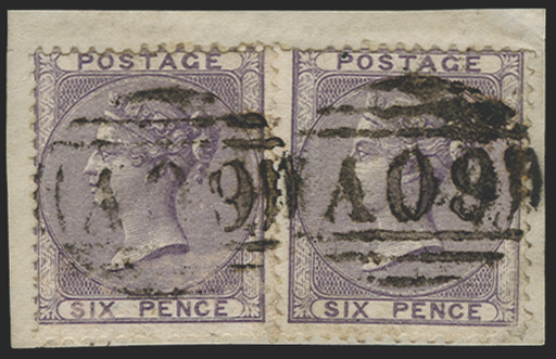 £350.00| /Nevis 1858-60 Great Britain 6d lilac CANCEL, SGZ4. Two overlapping examples tied to a piece by respectively fine and very fine strikes of 'A09'. Th...