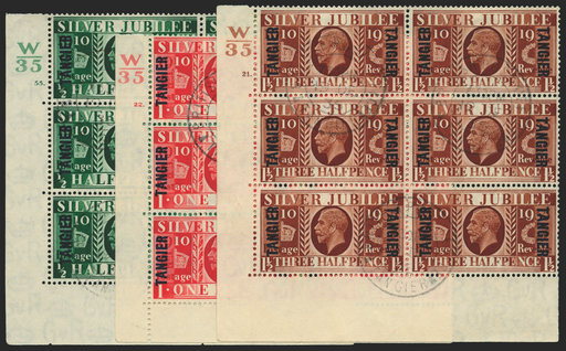 £250.00| /Morocco Agencies Tangier 1935 Silver Jubilee set of 3 (½d green, 1d scarlet, 1½d red-brown), in matching lower left corner blocks of 6 (2x3) with ...