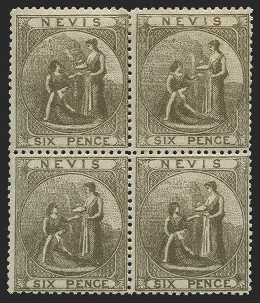 £750.00| /Nevis 1876-78 6d grey, litho printing, perforations 15, block of 4, SG19. A fine mint block with large part original gum, (lower pair unmounted min...