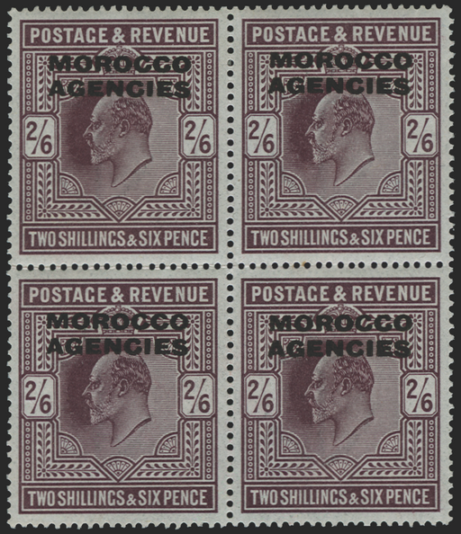 £165.00| /Morocco Agencies 1935-37 British Currency 2s6d chocolate-brown 'Seahorses', Waterlow re-engraved printing, block of 4, SG73. A fine unmounted mint ...