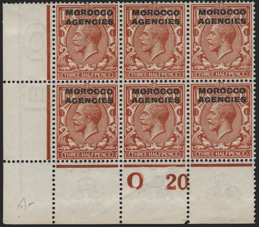 £75.00| /Morocco Agencies 1914-31 British Currency 1½d red-brown, Simple Cypher watermark, lower left corner 'O20' control block of 6 (3x2), plate 2a, perfo...